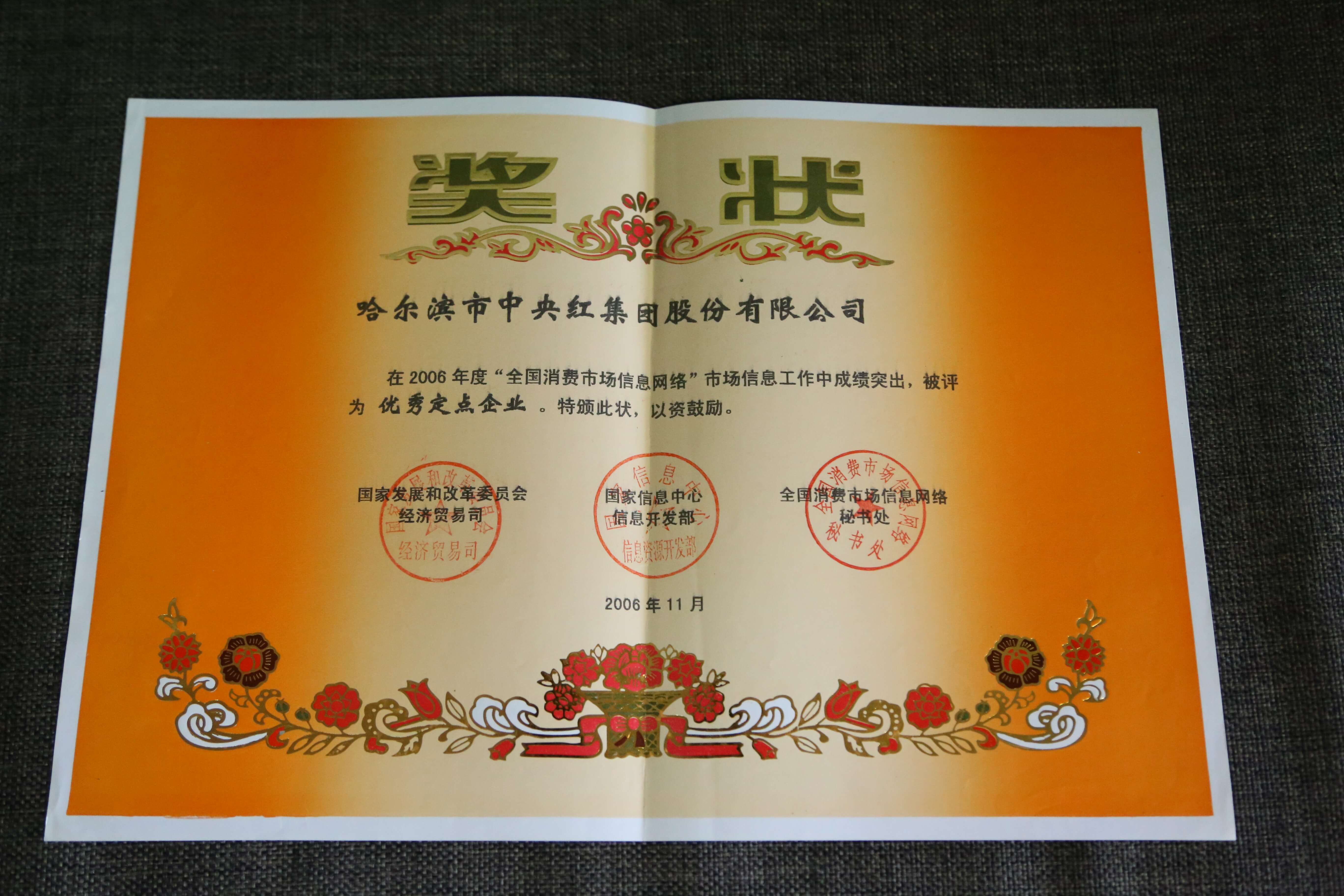 中央红集团在“全国消费市场信息网络”市场信息工作中成绩突出,被评为“优秀定点企业”