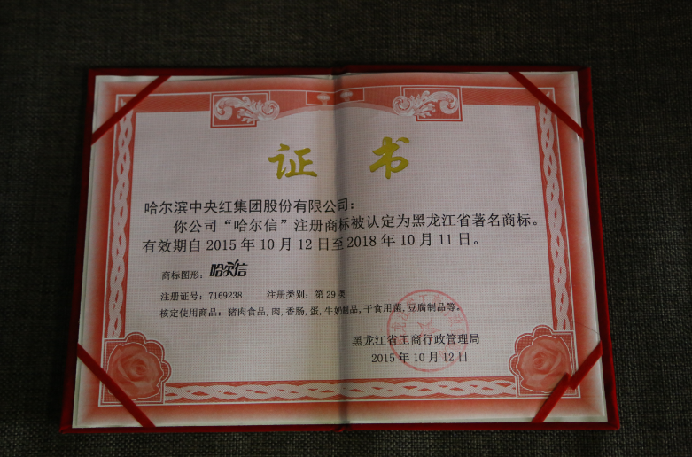 中央红自有健康品牌“哈尔信”被黑龙江省工商行政管理局认定为黑龙江省著名商标