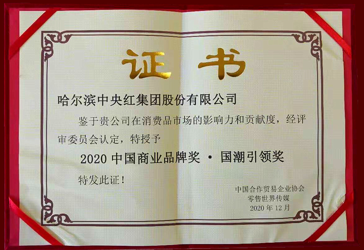 2020年中央红集团因在消费品市场的影响力和贡献度突出,被中国合作贸易企业协会、零售世界传媒授予“2020中国商业品牌奖·国潮引领奖”荣誉称号