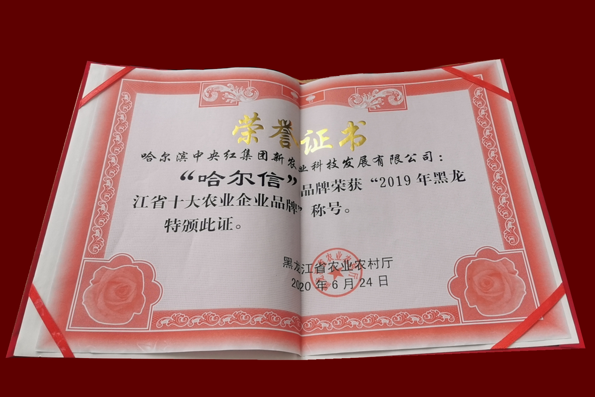 2020年,中央红集团新农业公司的“哈尔信”品牌被黑龙江省农业农村厅授予“2019黑龙江省十大农业企业品牌”荣誉称号