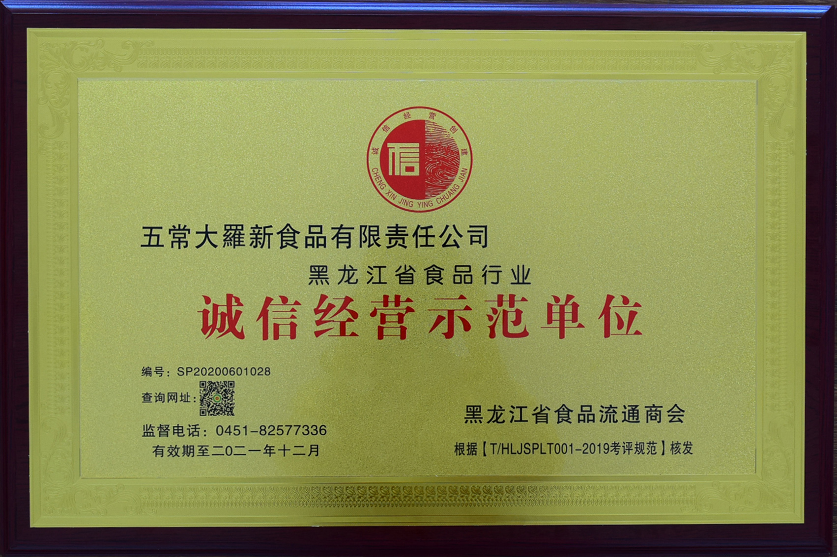 中央红集团五常大羅新食品公司被黑龙江省食品流通商会授予“黑龙江省食品行业诚信经营示范单位”称号