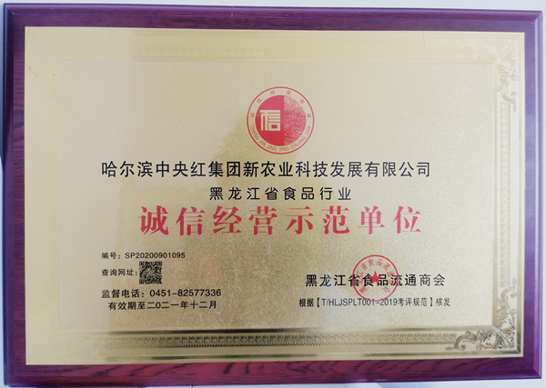 中央红集团新农业公司被黑龙江省食品流通商会评选为“黑龙江省食品行业诚信经营示范单位”荣誉称号