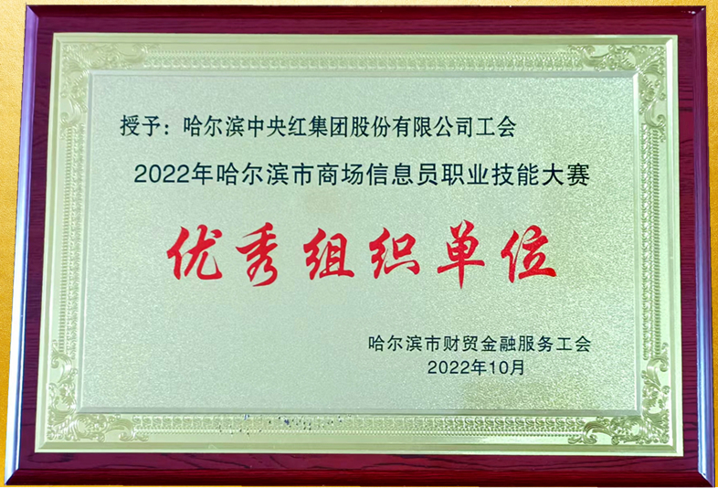 中央红集团工作在2022年哈尔滨市商场信息员职业技能大赛中被哈尔滨是金融财贸服务工会评为“优秀组织单位”。
